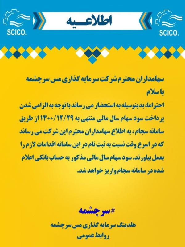 شرکت هلدینگ سرمایه گذاری مس سرچشمه با صدور اطلاعیهای از صاحبان سهام خود درخواست کرد برای دریافت سود سهام، در سامانه سجام ثبت نام کنند.