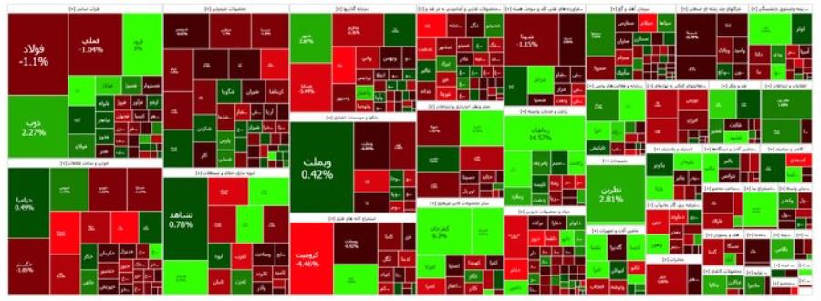 در معاملات امروز، نمادهای «فولاد، فملی و تاپیکو» بیشترین تاثیر منفی را بر شاخص داشتند. همچنین نمادهای «شهر، ثشاهد و وخارزم» پُرتراکنشترین نمادهای امروز بازار بودند.
