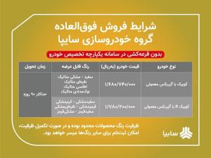 گروه خودروسازی سایپا، از امروز فروش فوق العاده دو محصول کوییک با گیربکس معمولی و کوییک.آر با گیربکس معمولی با موعد تحویل 90 روزه را آغاز میکند و این ثبتنام تا تکمیل ظرفیت محصولات از طریق سامانه یکپارچه تخصیص خودرو ادامه خواهد داشت.