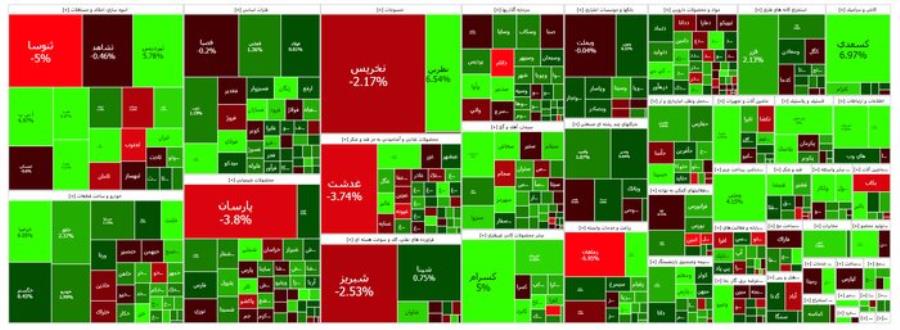 شاخص هم وزن ۳ هزار و ۸۴۵ واحد افزایش یافت و به ۷۲۷ هزار و ۹۶۱ واحد رسید. نمادهای «فولاد، حکشتی، فملی، اخابر و شستا» بیشترین تاثیر مثبت و نمادهای «پارسان و شبریز» بیشترین تاثیر منفی را بر شاخص بورس داشتند.