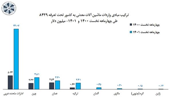 همچنین براساس این گزارش، ماشین آلات معدنی و راهسازی از ۸ کشور آلمان، مالزی، کره جنوبی، ژاپن، امارات متحده عربی، چین، عمان و ترکیه وارد شده که از میان آنها امارات متحده عربی با سهم ۶۷ درصدی، اصلیترین مبدا واردات انواع ماشین آلات معدنی به کشور بوده است.
